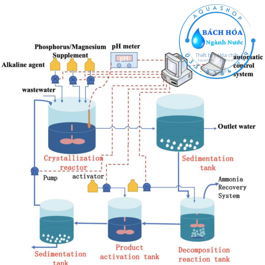 Công nghệ kết tủa Struvite (MgNH4PO4.6H2O) là phương pháp xử lý nước thải tiên tiến, giúp loại bỏ và thu hồi phốt pho và nitơ dưới dạng tinh thể phân bón chậm tan. Quá trình này diễn ra trong điều kiện kiềm nhẹ (pH 9-9.5), bổ sung Magie (Mg2+) để tạo kết tủa từ nguồn nước thải giàu dinh dưỡng (chăn nuôi, thủy sản).