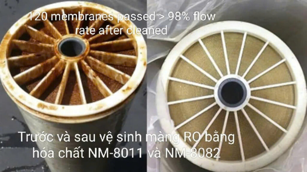 Hình: Hình ảnh so sánh hiệu quả vệ sinh màng RO bằng Hóa chất NM-8011 và NM-8082